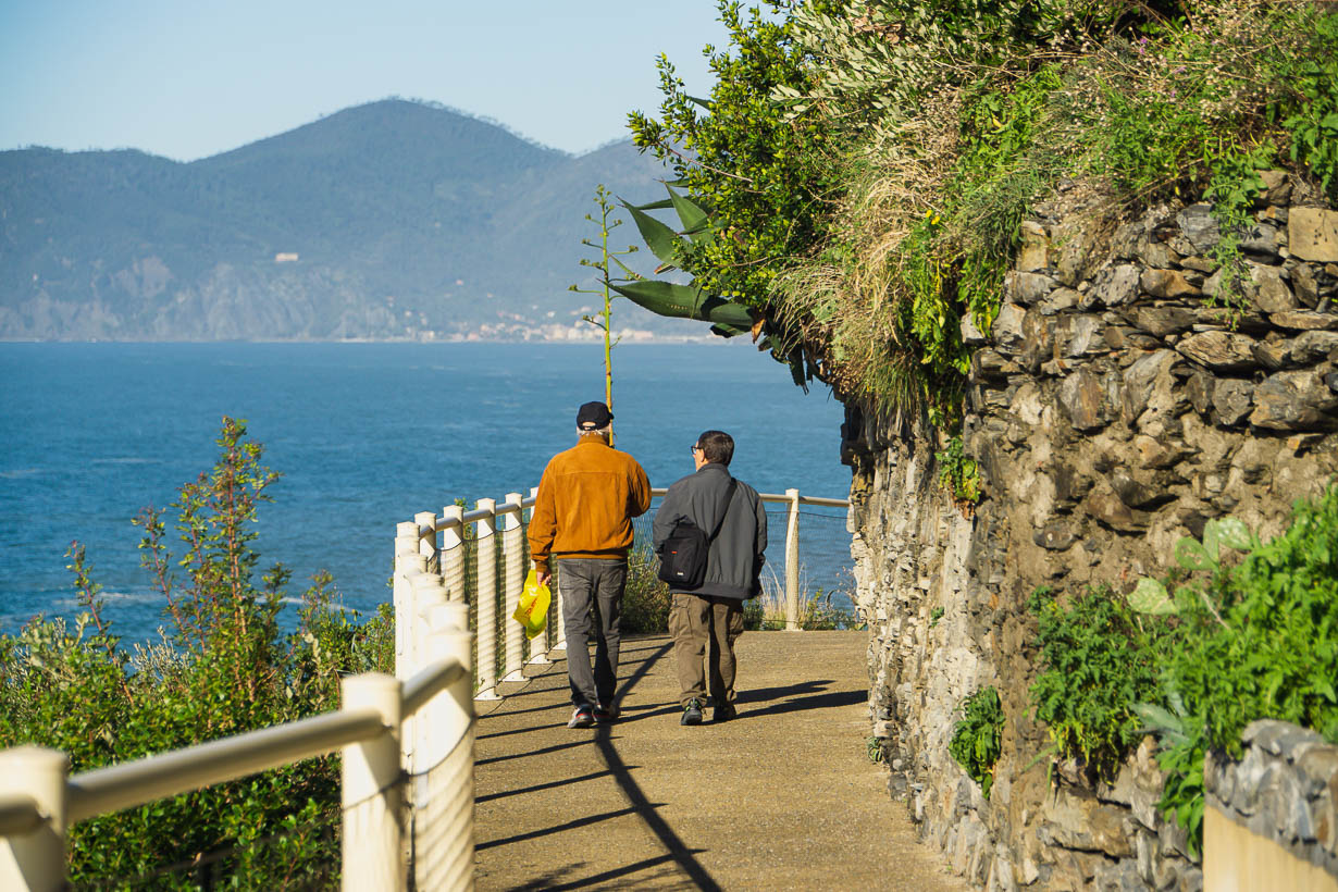 Przejście między Riomaggiore a miasteczkiem Manarola to właśnie ta drogocenna i legendarna Droga Miłości. To lekki, łatwy i przyjemny spacer z widokiem na Morze Liguryjskie. Po dojściu do miasteczka Manarola warto usiąść na relaksującej kawce i pogapić się na okoliczności przyrodniczo-architektoniczne, mimo że padające na domki ostre słońce, nieco uszczknie z malowniczości. Nade wszystko zachęcam Was do takiego porannego popasu, bo od godziny 10.00 zaczyna się prawdziwy najazd Hunów i miasteczko po prostu pęka w szwach.