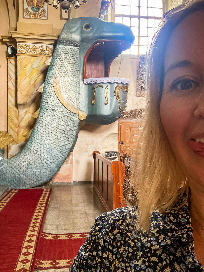Czy barokowa ambona w kształcie wieloryba warta jest kluczenia po zapomnianych wioskach i drogach prowadzących nie-wiadomo-gdzie? A i owszem! Niewielki, zabytkowy kościół św. Jadwigi w miejscowości Dobroszów to zdecydowanie jeden z najwspanialszych punktów na mapie Dolnego Śląska! Niepozornie wciśnięty między domostwa niewielki kościół, skrywa w sobie taką wspaniałą ciekawostkę, która od razu znalazła osobne miejsce w moim wrażliwym na takie kurioza serduszku. No sami zobaczcie! Czyż nie jest to cudowność?