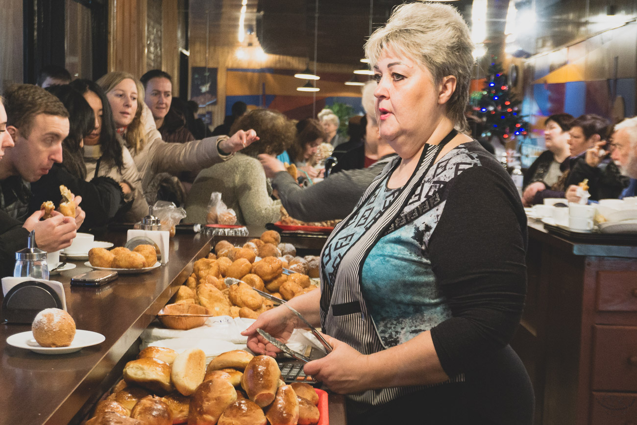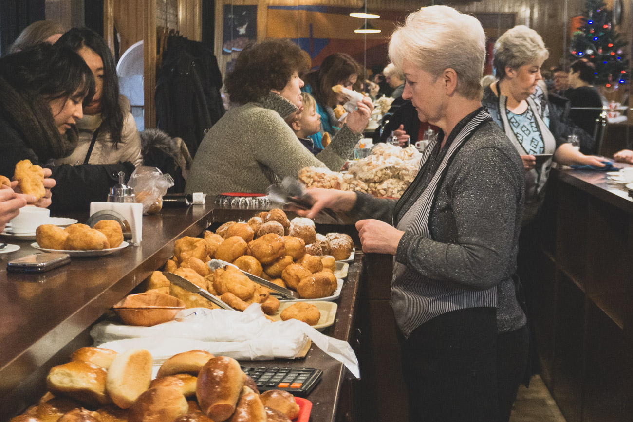 Mimo wielkiej popularności wśród mieszkańców Kowna, właścicielki nie chciały się zgodzić na poszerzenie działalności i otworzenia kolejnego lokalu. Ta mała cukiernia, w której czas się zatrzymał i nie chce ruszyć dalej w zupełności im wystarcza. Bardzo polecam i zachęcam do popełnienia zbrodni na swoim brzuszku, wsuwając ciepłego pączka z nadzieniem jabłkowym i serowym! Powiadam – warto!