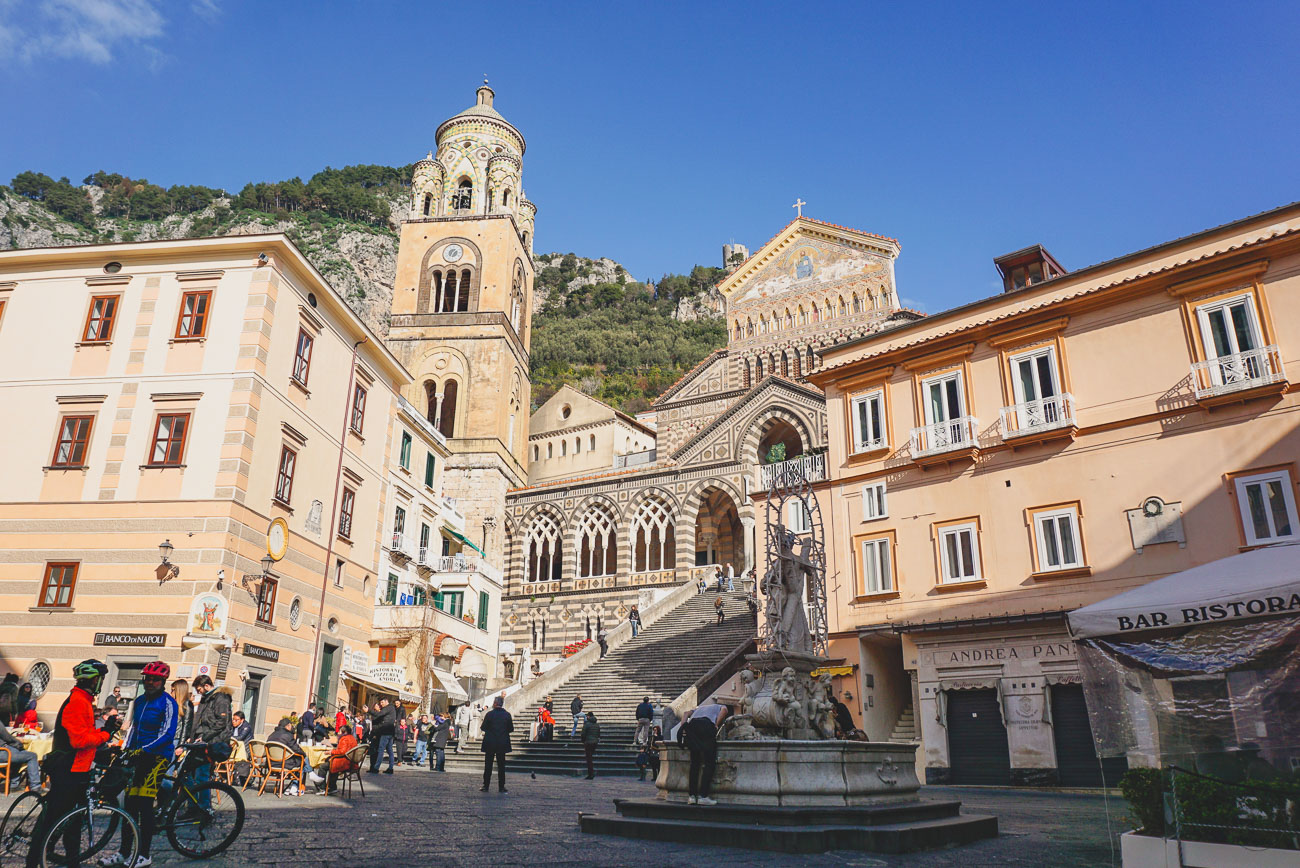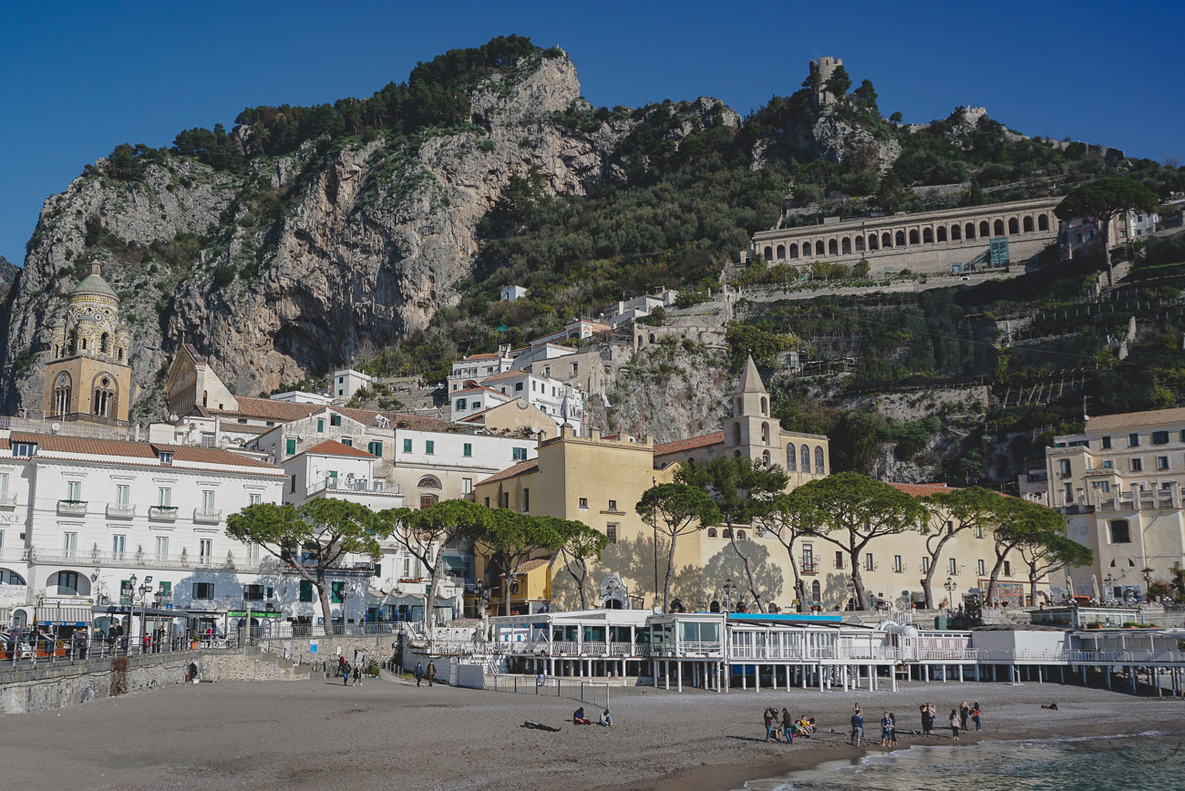 Amalfi to niewielkie miasto, którego sieć wąskich i ciasno oplatających starówkę uliczek z miejsca Was odurzy. Już od strony wybrzeża uwagę przykuwa dzwonnica katedry św. Andrzeja mieniąca się tysiącem kolorów. Zanim jednak do niej dotrzecie – wdrapcie się na wszystkie wysokie schody, potem schodźcie jeszcze bardziej stromymi stopniami do niebotycznie wąskich zaułków, aby na końcu stanąć przed katedrą i zachwycić się jej fasadą. Gdyby nie to, że w Kampanii moje serce zostało gdzie indziej, Amalfi zajęło by pierwsze miejsce wśród najpiękniejszych miejscówek, które odwiedziłam w całym swoim życiu!